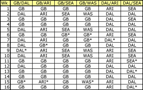 The following table shows which weeks you should start which teams. Teams with an asterisk project to outscore the other team in the combo by less than a point, so as the season wears on, and it becomes clear that the other team is playing better defense and/or has a better matchup, you may want to call an audible and start them instead.