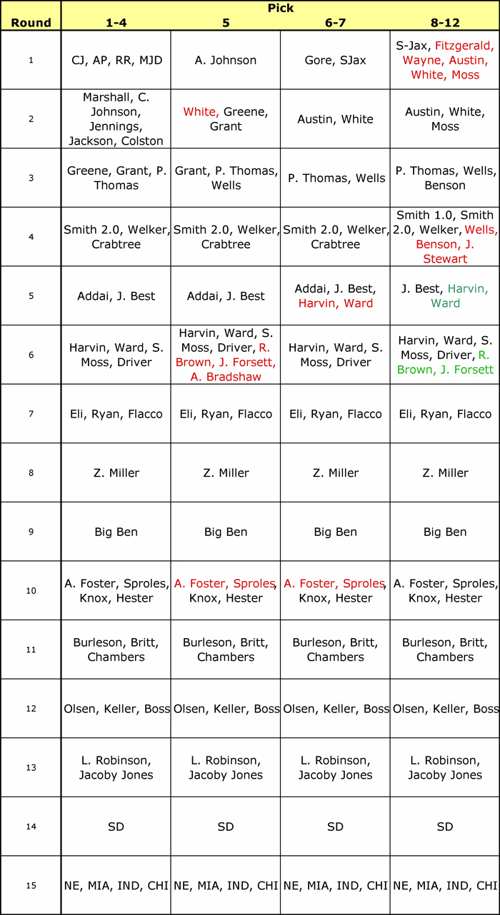 If you have the #5 pick and one of the top four RBs is there, grab him. If not, draft Andre Johnson and zag while everyone else is zigging. On the way back, you’d target Roddy White (but if Miles Austin or Randy Moss slips, jump on them). If they’re all gone, grab Greene or Grant. As the draft wears on, if you’re fine with running with only three RBs, you can go with a WR in the 10th (Hester or Knox). But if you do grab White in the 2nd, you better go RB with a later pick, like Foster or Sproles in the 10th, or maybe Ronnie Brown, Justin Forsett or Ahmad Bradshaw in the 6th. That’s why those players (along with White) are listed in a different color.