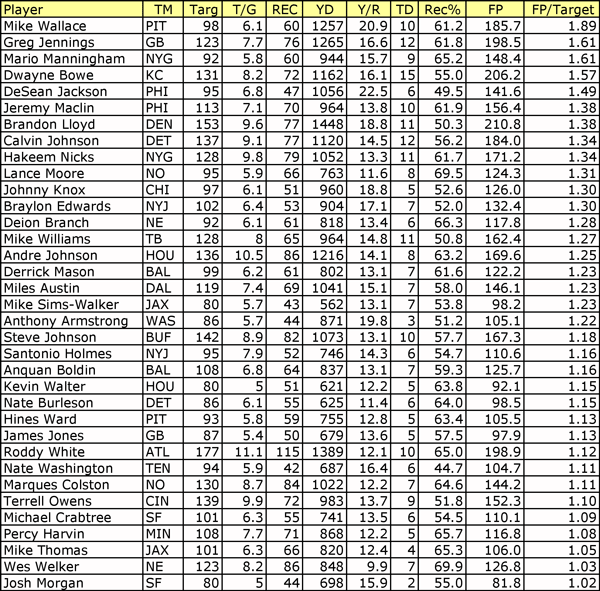 – These numbers don’t include a point per reception, so they’ll skew more towards the big play, TD-heavy wideouts. I also limited the scope of the table to those receivers who saw at least 80 targets. Of the players who were targeted 30-79 times, a few names stand out: Kenny Britt (1.80 FP per target), Austin Collie (1.57), Ben Obomanu (1.50), Malcom Floyd (1.40) and Dez Bryant (1.26) would have likely finished in the Top 20 in FP/T had they stayed healthy. Jerome Simpson (1.90) was only targeted 24 times, but obviously did a lot (20-277-3) with those looks.