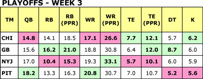 Ben Roethlisberger has the best matchup of the QBs, but keep in mind that the Jets numbers are inflated due to the stint where Darrelle Revis was out earlier in the season. I’d still start Rodgers ahead of Big Ben despite a so-so matchup with the Bears…James Starks looks like a sleeper at RB this week, while the NYJ wideouts could surprise against the Steelers…Greg Olsen looks like the best play at TE, and seems to have good games against the Packers.