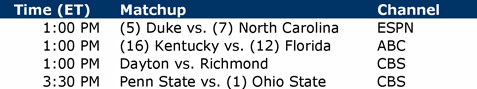 There are four interesting games today, but the only team probably playing for an NCAA tournament bid is Dayton in the Atlantic 10 Final. ESPN bracketologist Joe Lunardi has Richmond safely in as a #10 seed, but if the 22-12 Flyers can pull the upset, that means one of the teams on the bubble won’t get a bid…Duke and North Carolina square off for the third time this season after splitting the first two meetings. Lunardi has both teams slated for a #2 seed, so the winner has a shot at a #1 seed assuming the committee isn’t sold on having two Big East teams (Pitt and Notre Dame) who lost early in the Big East Championship as #1 seeds. Pitt’s resume shapes up better than Notre Dame’s, and I’d wager that the winner of the Duke/UNC game (especially if it’s Duke) gets a #1 seed instead of the Irish…Florida and Kentucky are both slated for #3 seeds, so the SEC won’t have a huge impact on the seeding, though the Gators could potentially move to a #2 seed if the committee doesn’t give their three bad losses (Jacksonville, South Carolina, Mississippi State) much weight. Florida is 11-2 against the RPI Top 50 — that’s impressive…Lunardi has Penn State as a #12 seed and given the Nittany Lions’ nice run in the Big Ten tourney, they should be in. Ohio State will be a #1 seed win or lose.