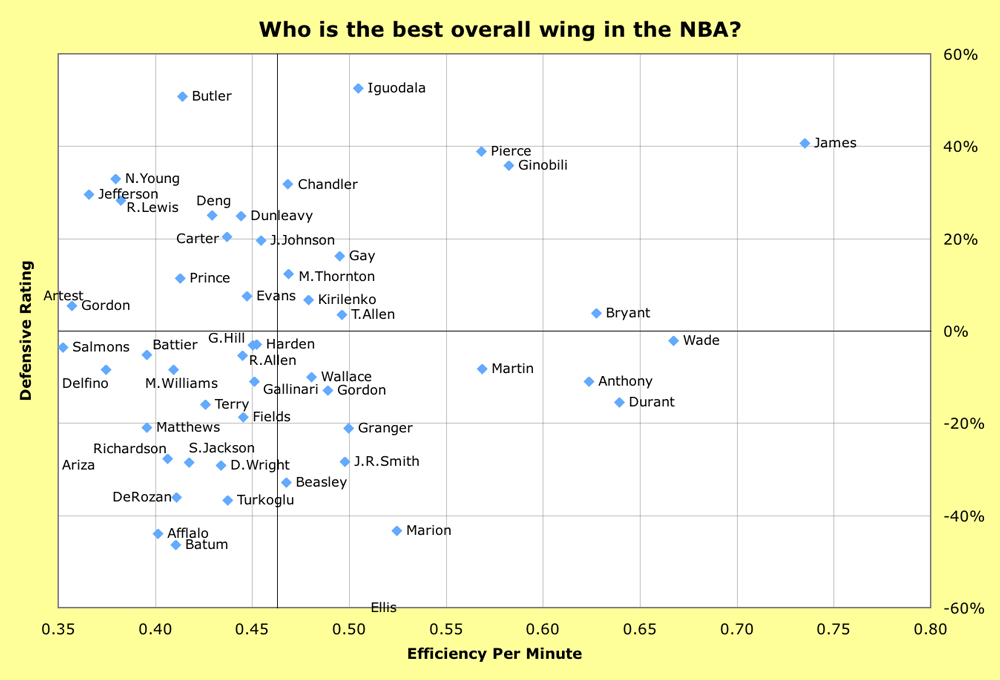 Below is a chart of the Top 52 wings in the NBA. I took the Top 48 in terms of Efficiency Per Game and then added four players (Marcus Thornton, Tony Allen, Ron Artest and Ben Gordon) that I was interested in studying. As always, click on the chart to see a bigger version.