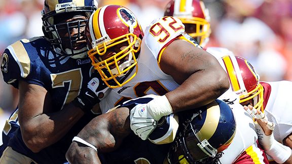 I signed with the Redskins expecting to be a havoc-creating, quarterback-attacking playmaker in a 4-3 defense. That’s the role in which I excel; that’s the style of play I enjoy; that’s what was promised during my free-agent courtship. Only now, the team has shifted to a new coaching staff and a new 3-4 scheme, which basically asks me to eat double-team blocks. Thanks, but no thanks. I’d like a little more excitement. A lot more glory. Please send me somewhere else.