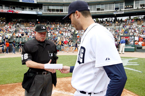 On Thursday, Joyce was set to call balls and strikes behind the dish at Comerica Park for the third and final game of the Tigers-Indians series. When the Tigers were ready to turn in their lineup card, Detroit skipper Jim Leyland sent out none other than Galarraga to meet Joyce at home plate.