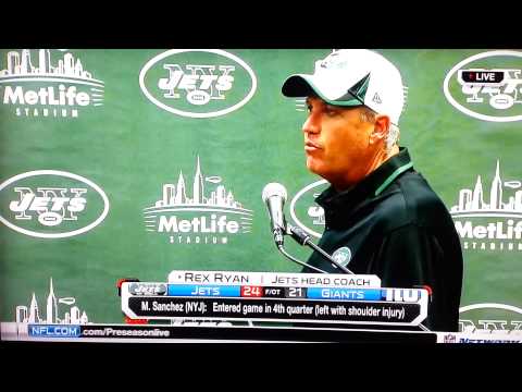 + At this point it would be an upset if Rex Ryan wasn’t handed his pink slip before the end of the regular season. What he did Saturday night in New York was a joke, inserting his starting quarterback Mark Sanchez into a game that didn’t matter and watching him get planted by Marvin Austin. The result was rather Jets-like: Sanchez was injured and now Ryan will likely be forced to play rookie Geno Smith Week 1. (And that isn’t a good thing, as Smith looked completely overwhelmed in a disastrous performance on Saturday.) What was it all for? Apparently the annual “Snoopy Trophy,” which is handed to the winner of the Jets-Giants preseason game. Ryan and the Jets have progressively gotten worse every year he’s been head coach. He doesn’t have a handle on how to manage quarterbacks, he hires overmatched assistants, and no offensive player has show improvement under his guidance. He should go back to doing what he does best: Coordinate defenses.
